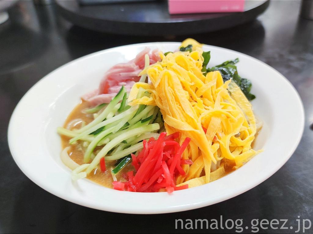 注文したのはオーソドックスな冷し中華(900円)です。ゴマダレの敷かれたお皿に、手打ち麺、きゅうり、卵、ハム、わかめ、紅生姜が彩りよく盛り付けられています。きれい!そして具だくさん!