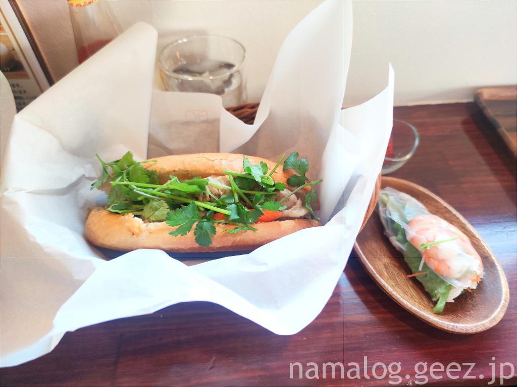 4種類のバインミーから選んだのはこだわりベトナムハム(780円)。それと生春巻きのセット。生春巻きは単品だと250円なんですけど、セットにすると少し安くなります。パクチー増しのオプションがあるんですけど、増さなくても十分な量のパクチー。