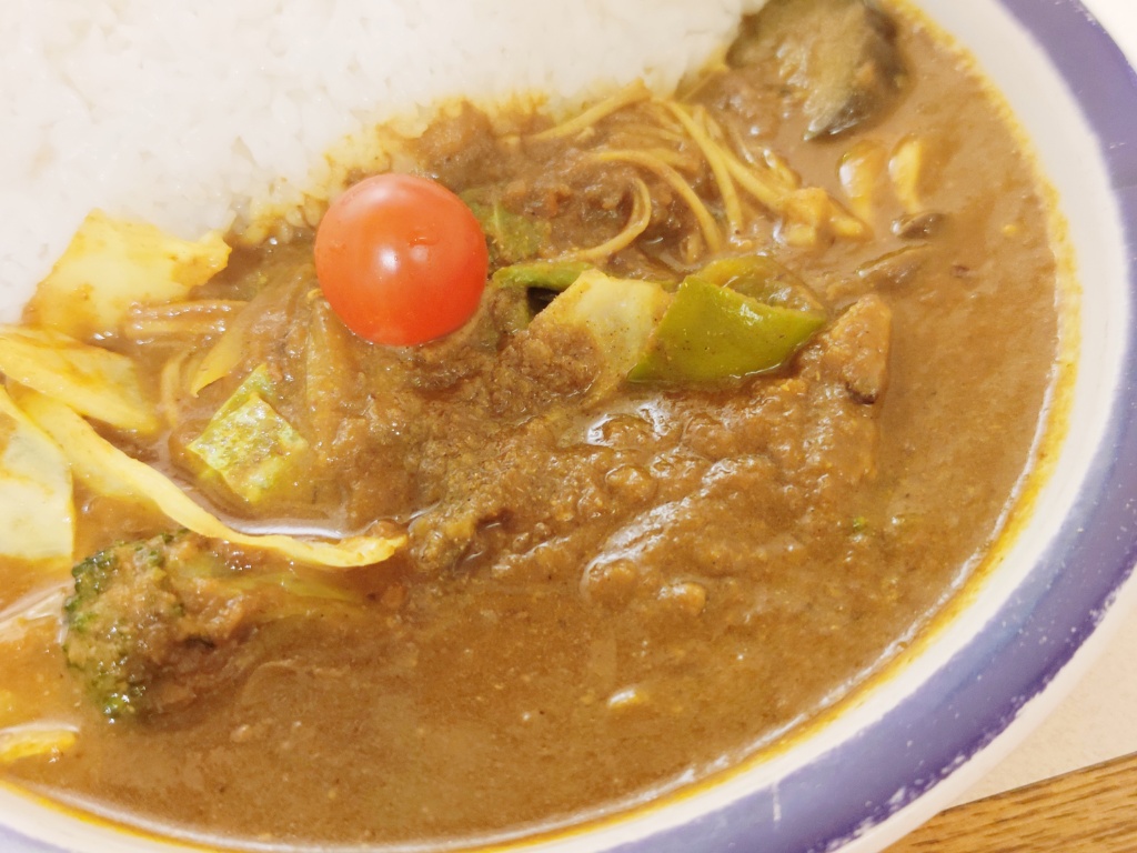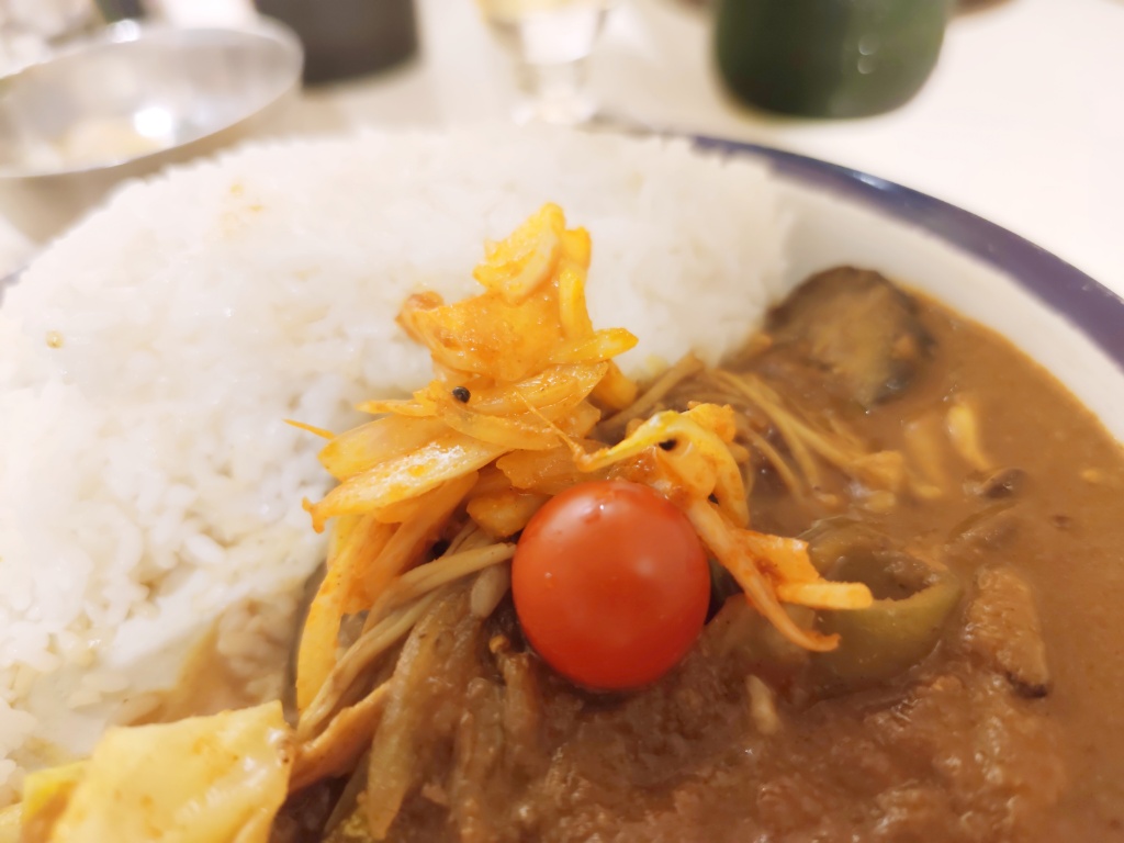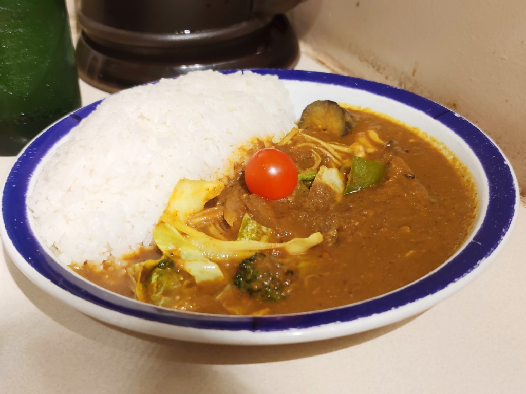 最後に到着。野菜カレーです。70倍まであるということで気が大きくなり、12倍(大辛)にしました。野菜カリーはキャベツ、ピーマン、ナスなど、野菜がたっぷり。スパイスがしっかりと効いたカレー。もしかしたら野菜のおかげかな?辛さはそれほど強く感じず、心地よい辛さだったんですけど、額からは汗が止まりませんでした。