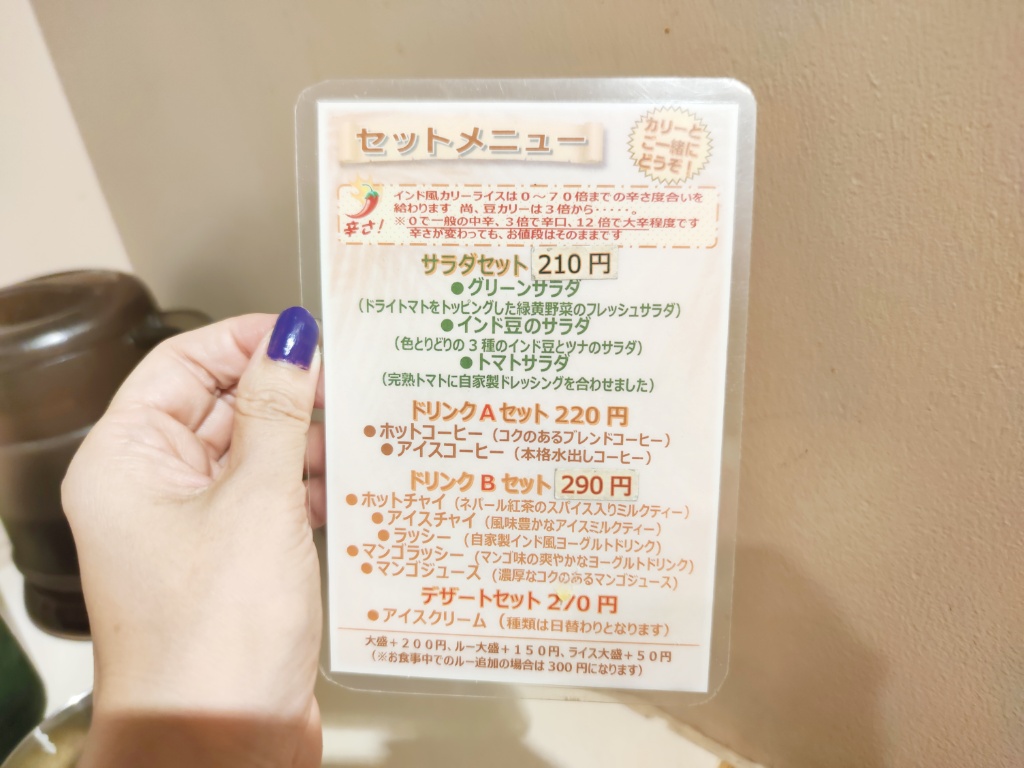 卓上に置いてあるセットメニュー。卓上に置いてあるっていうことはあとから現金でも受け付けてくれるのかな?辛さは0から70倍まであるそうです。値段が書いてないということは同じ・・・?太っ腹ですね。