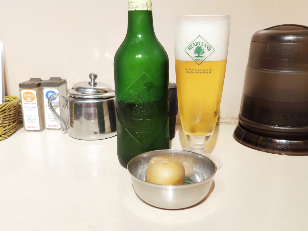 そして次に届いたのはビール(500円)。ハートランドでした。スパイスをパラパラふりかけたじゃがいもはビールのおともに最適。