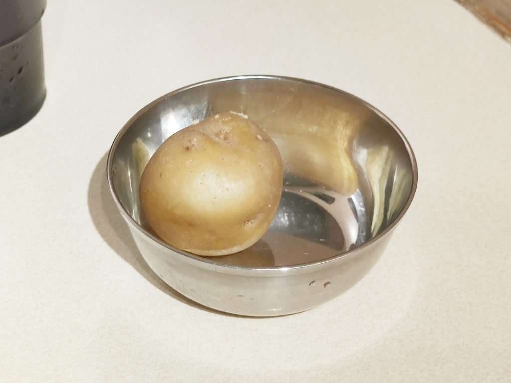 食券を渡し、席へ着くとまずやってきたのが・・・イモです。じゃがいも。神保町のカレー屋さんの多くが採用しているじゃがいも配給(笑) 小食には、宿敵ともいえる存在です。なぜって、おいしいんですよ。エチオピアのじゃがいもも。ホクホクではなく、硬さもしっかり。歯でするっと嚙み切れて風味もよいです。卓上のスパイス塩はもちろん、カレーをつけて食べても。