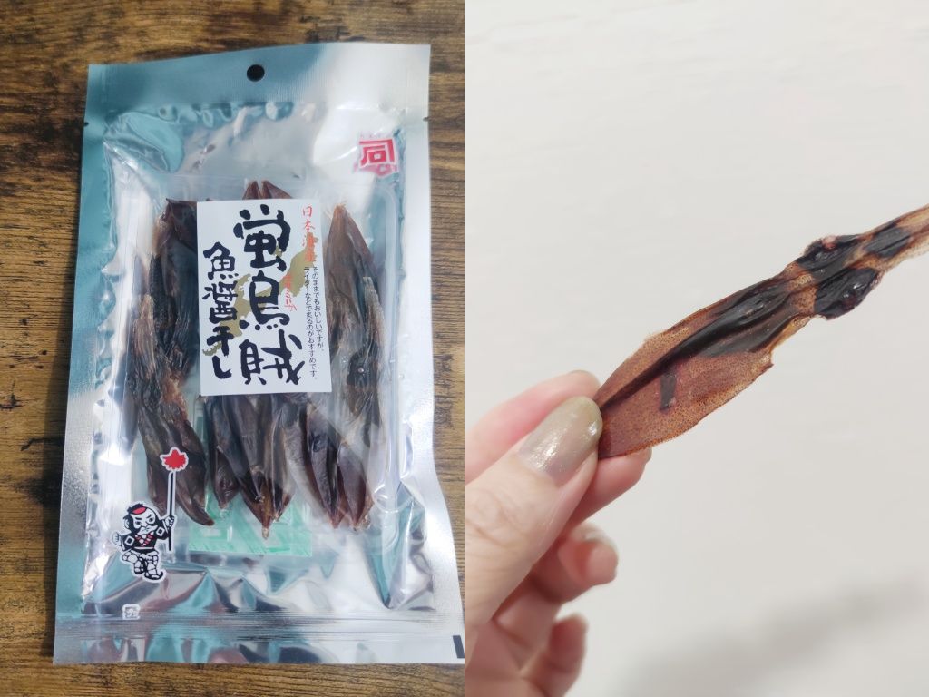 魚醤というのは、生魚を塩で漬け込んで発酵させることでできる液体。ナンプラーも魚醤ですね。その魚醤で漬け込んで干したものがこれ。ぺったんこになってます(笑) そのまま噛むと、一種の塩漬け状態なのでしょっぱいです。でも噛むごとにほたるいかと魚醤のうまみが・・・。いったん漬け込んであるせいか、やわらかいです。