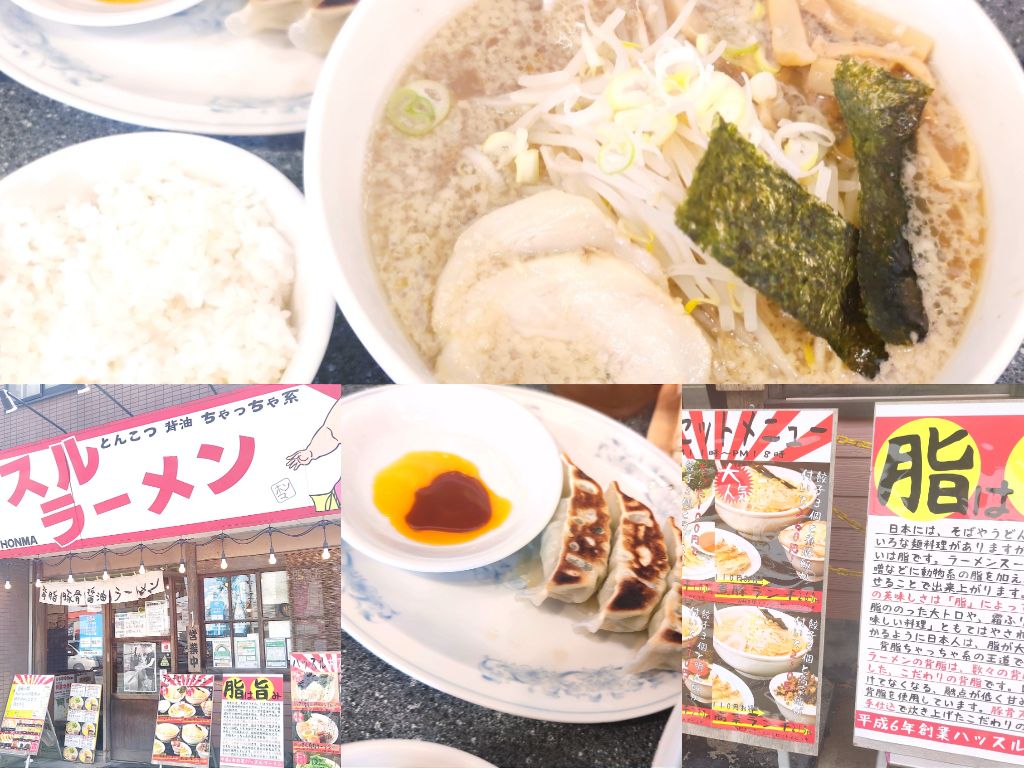 背脂の浮いたコッテリ系ラーメンといえば、なりたけが真っ先に思い浮かぶんですけど、ちょっと違う店がいいな~と、思い浮かんだのが、篠崎にある、ハッスルラーメンホンマ。都内にいくつか支店があるんですけど、私が行きやすい場所、篠崎。本店は亀戸です。かなり目立つ外観。