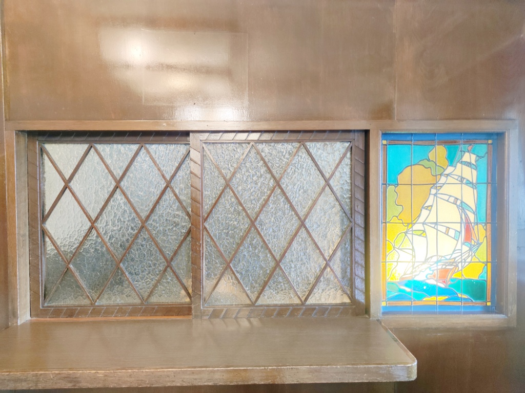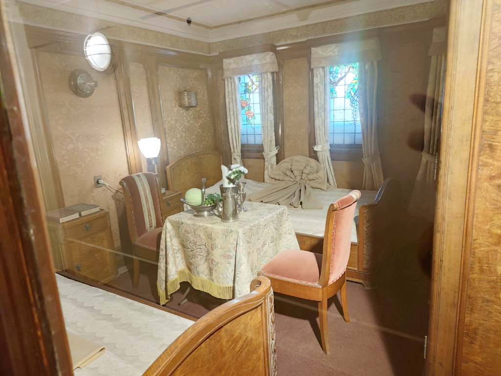 一等客室の中でも貴賓室は隣にも部屋があって倍ぐらいありました。窓もステンドグラス。(右の影なんだろう・・・私の指かな・・・)