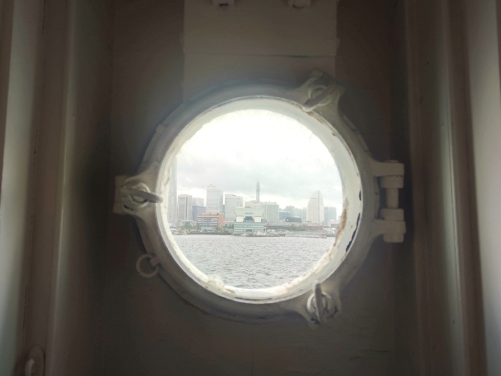 客室のあるフロアにはこういった丸窓があって、外の景色をながめられました。当たり前ですが、みなとみらいです(笑)