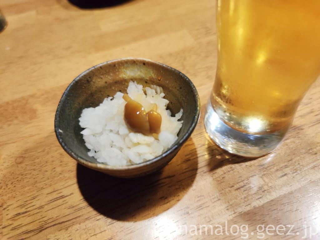お通し代は500円です。なめこおろしでした。鬼おろしでおろしたような、みじん切りにも見える粗いカット。大根のシャキシャキ感が心地よい。焼き鳥の合間の箸休めにもちょうどよく、いや、その箸休めのためにもおかわりしたかったです(笑)