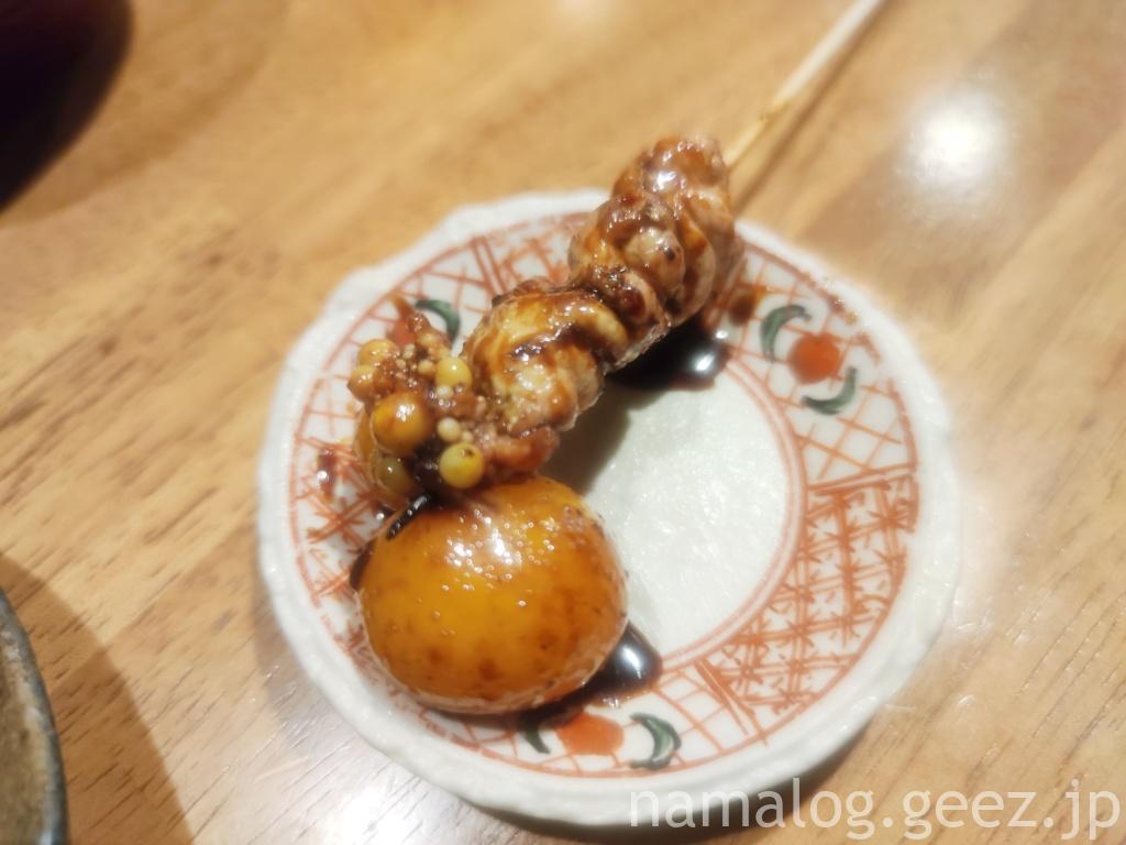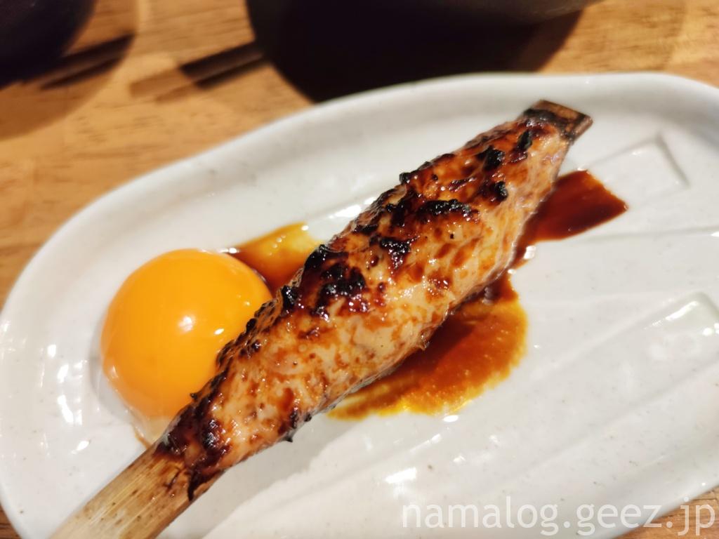 つくねお月見(380円)も注文。そういえば1本の焼き鳥の値段が高めかな?と思ったんですけど、ボリュームがあるので、値段的には納得です。つくねは軟骨も入っていていてニクニクしい食感。濃いめだけれど、甘さ控えめのタレがかかったつくねを黄身を絡めながら食べるんですけど、やっぱり黄身トロリは正義ですよね(*’ω’*)