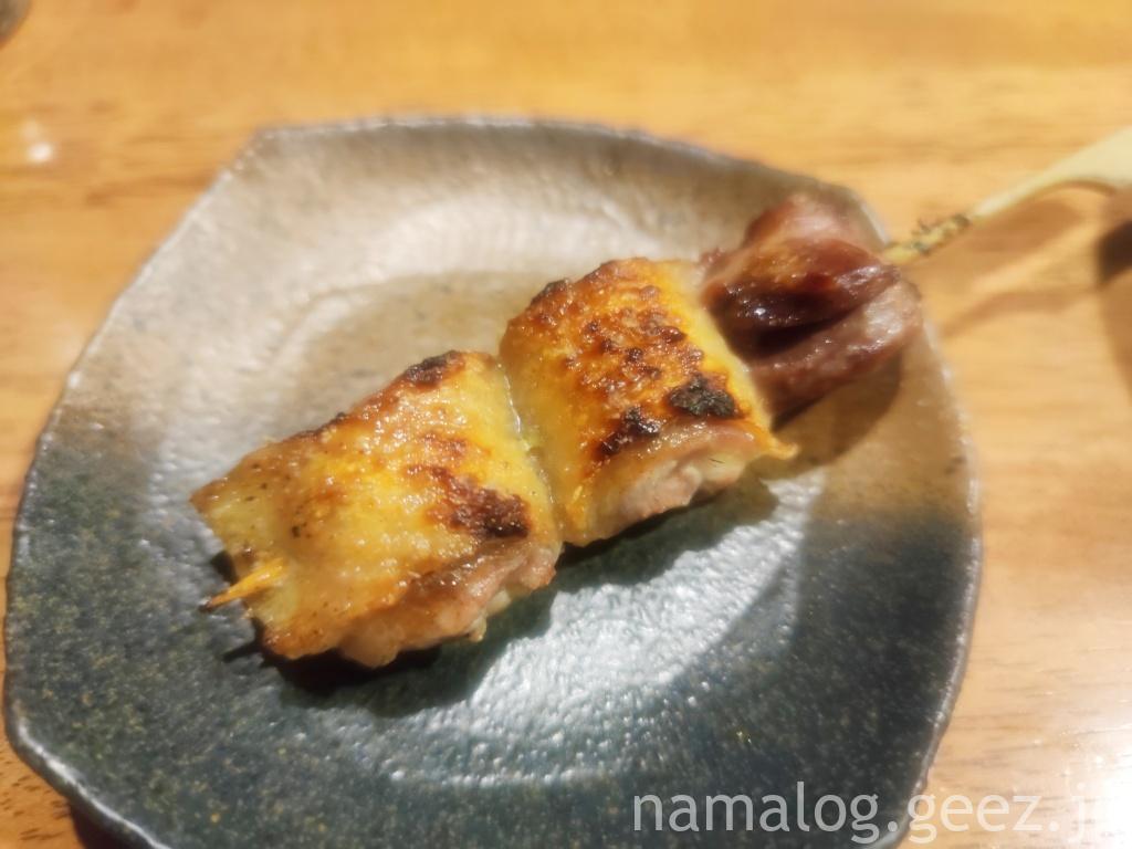 焼き鳥も何本か注文。ソリレスと帯(380円)。ソリレスというのはももの付け根部分で筋肉の部分。引き締まっていて噛み応えのある部位。1羽から1本しかとれない希少部位なんだそうです。私はこれが好きで、あると注文します。皮が少しパリッとしてジューシーで筋肉質な部位とのバランスがとてもよかったです。