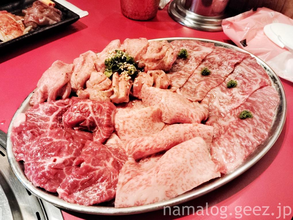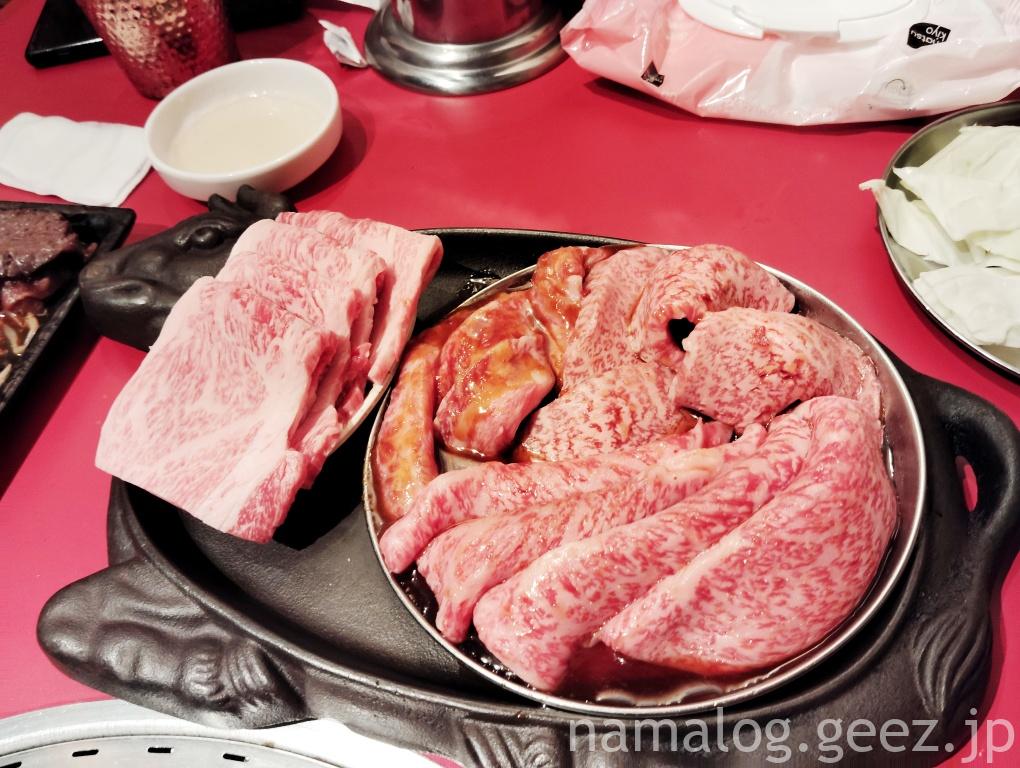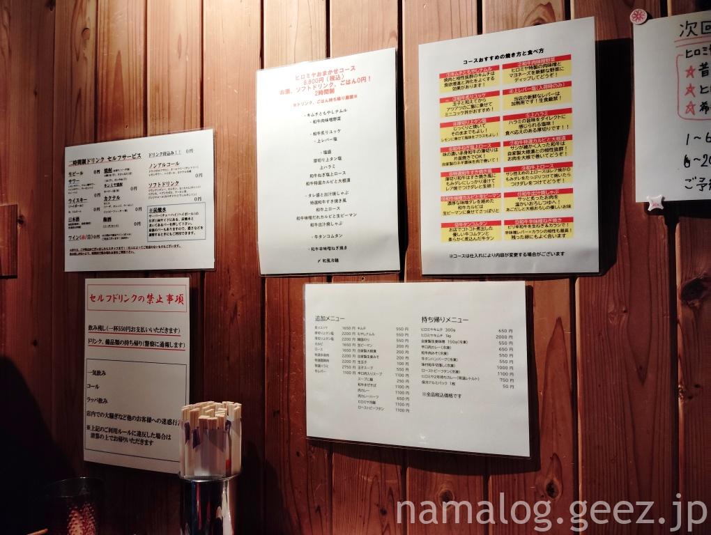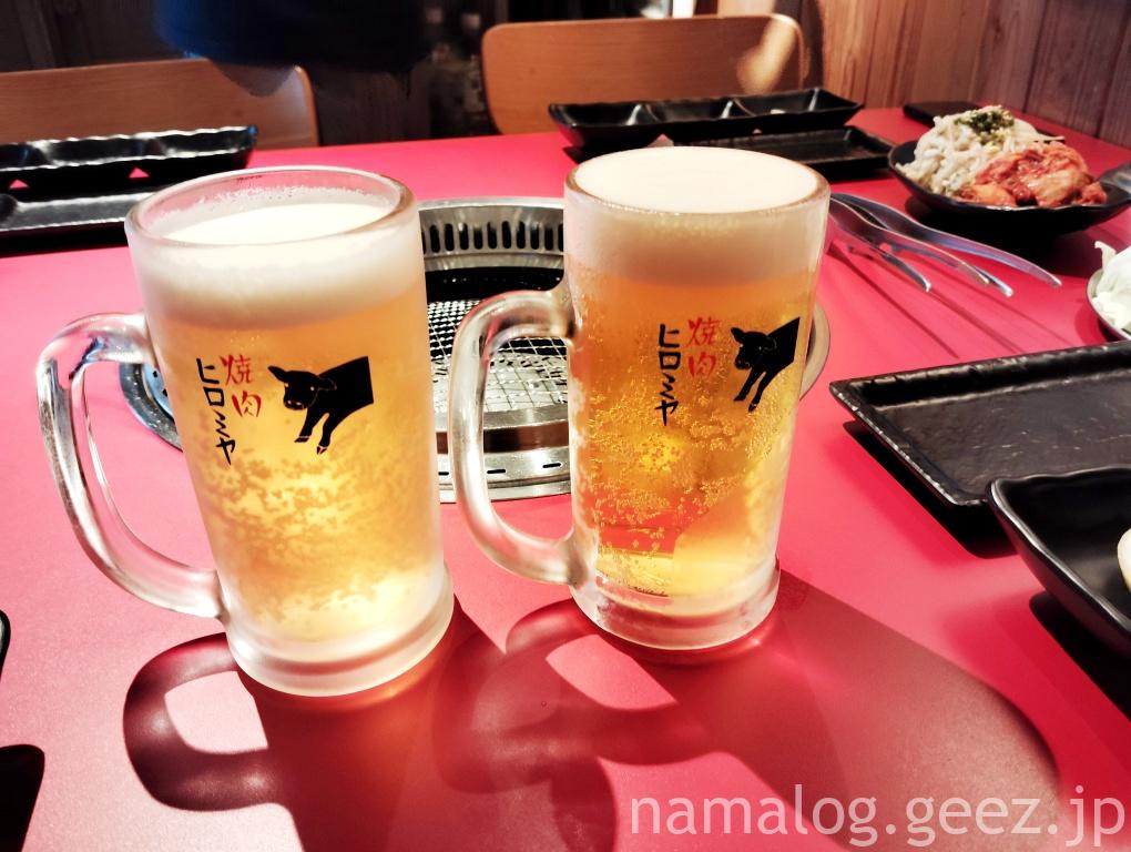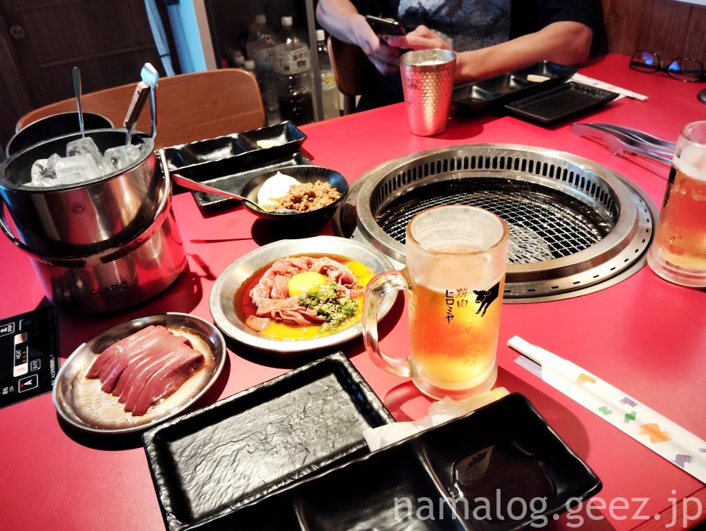 ヒロミヤは基本的に焼肉コース(税込み8,800円)で、足りなければ追加注文をするというかたちになります。飲み放題が自動付帯。というか、冷蔵庫やビアサーバー、ハイボールサーバーが各テーブルに割り当てられ、勝手にやって、状態。というのも、給仕はほぼワンオペ。この新本店は2階もあって、2フロアワンオペという、驚異のワザを成し遂げる店員さんに脱帽。というわけで、なるべく店員さんの手を煩わせないようにと、空いたお皿は通路側に置いたり・・・、なぞの使命感が我々に生まれました(笑)