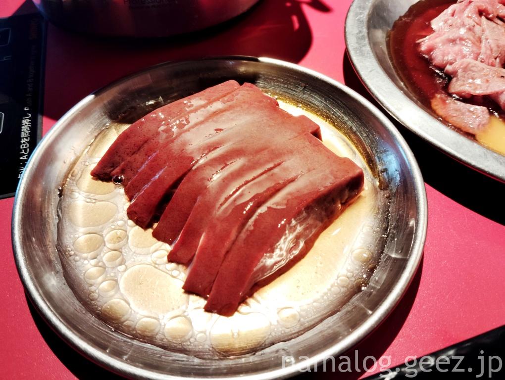 氷は卓上に用意してくれていました。席につくとまもなく、いろいろ運ばれてきました。和牛ユッケ、レバー、和牛肉味噌野菜。写真は撮り忘れたけれど、キムチやナムルも。通された1階は1卓しかないので貸し切り状態でした。
