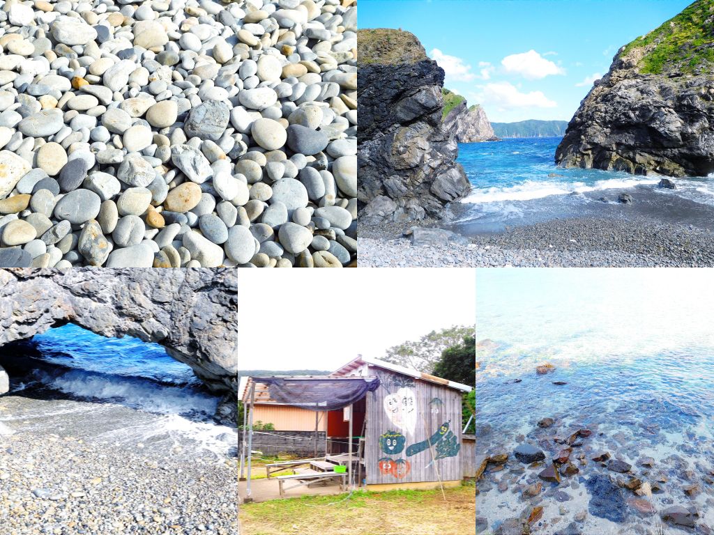 この丸い石がカラコロ音を立てるんだそうですが、この日は結構風が強く、波が荒かったため、ほとんど波音にかき消されていました。とはいえ、踏みしめると何とも言えない音がして面白かったです。中が空洞なのかな?踏むと”キュッ”って言うんですよ。