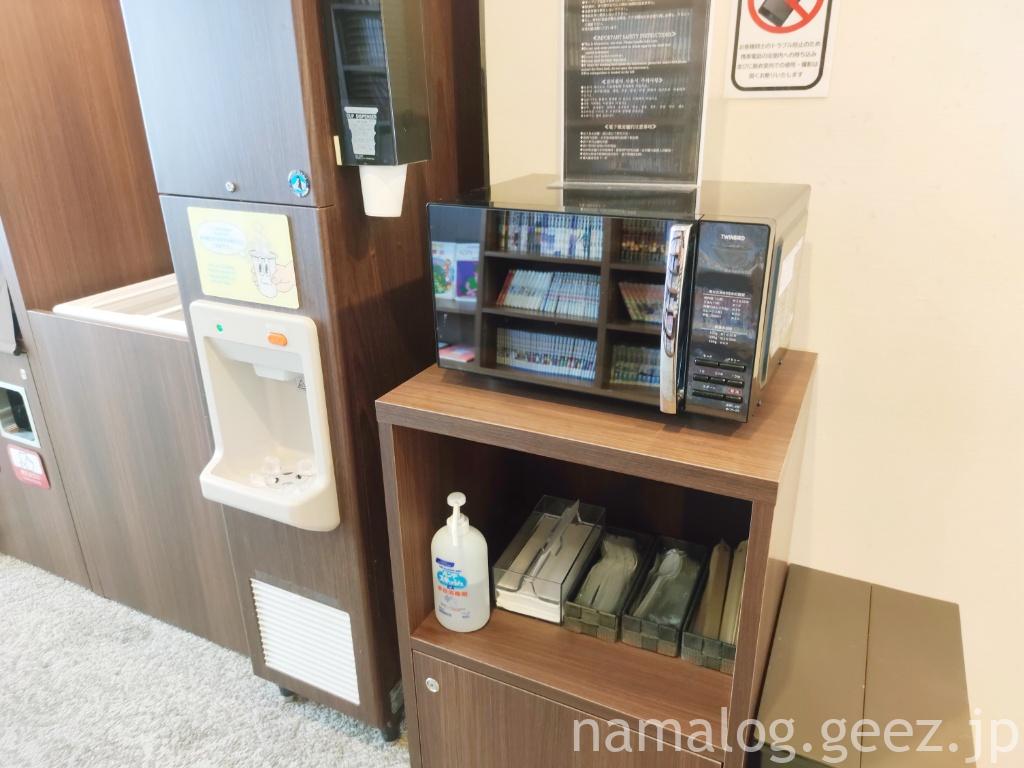 お風呂から出た後は休憩スペースでひとやすみ。給水機が置いてあります。