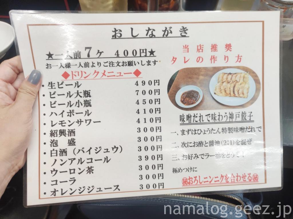 メニュー。一人最低2皿からというお店もある中、ひょうたんは1人前だけでも餃子がオーダーできるのがいいですね。ドリンクも比較的豊富。ちなみにミント神戸にもお店があるんですけど、そちらは枝豆や冷ややっこ、油淋鶏などのおつまみもあり、ランチタイムは餃子定食なんかもあるので、食事を楽しみたいという人や、もう少し料理のバリエーションが欲しいという人、事前に予約をしていきたい人はミント神戸がおすすめです。