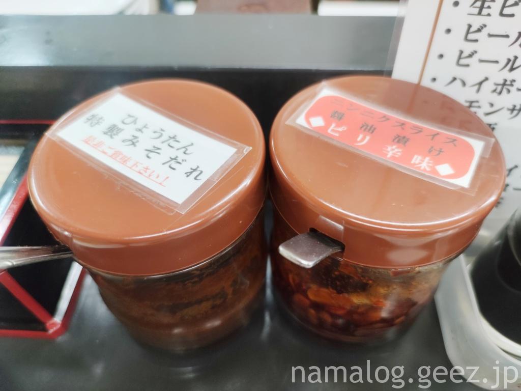 餃子しかないし、そもそも餃子を食べに来たのでぎょうざ(400円)を注文した後は卓上にある調味料でたれを作ります。醤油、お酢、ラー油も用意されているけれど、やっぱり神戸餃子といえば、これ。味噌だれ。ひょうたんは特性味噌だれとニンニクスライス醤油漬けが用意されてます。