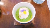 黄色が鮮やか。すっごく甘いトウモロコシ! 意外にカマスと合いますね。ハーブはシャーレに別添えです。最初このまま楽しんだ後、ハーブをわさわさかけます。