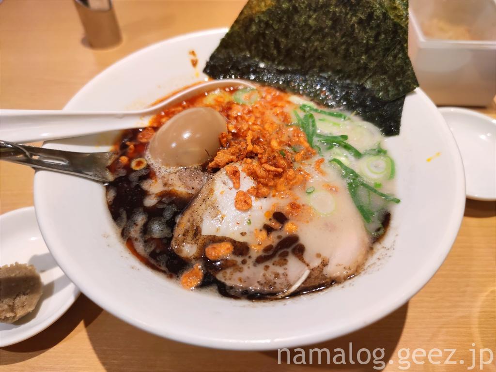 赤丸新味の全部乗せ、特製赤丸(1,250円)にしました。ベーシックな白丸にオリーブ香油・辛味噌をトッピングしたものなので、スープはピリ辛。でも赤赤とした見た目ほどの辛さはなく、ほどよい感じです。もっと辛いのが好きな人には、「からか麺」がオススメだそう。炙りチャーシューが肉厚でやわらかい。
