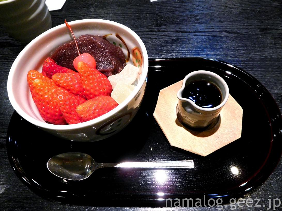 苺あんみつと温かいごまきしめん。苺あんみつ!他のあんみつと同じく、みつは黒みつと白みつから選ぶことができます。