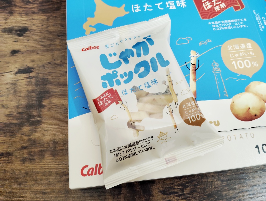 ほたて塩味はその名の通り、ホタテのうまみが感じられるバージョンです。北海道産ほたてから作られたほたてパウダーを0.02%使用していて、食べると貝のうまみと塩気が口の中に広がります。普通のバージョンは「じゃがいもの風味と塩気」、このほたて塩味は「ジャガイモの風味とほたてのうまみと塩気」です。その分少し塩気が強い気がします。なので、おやつはもちろん、おつまみにも最適なのです。