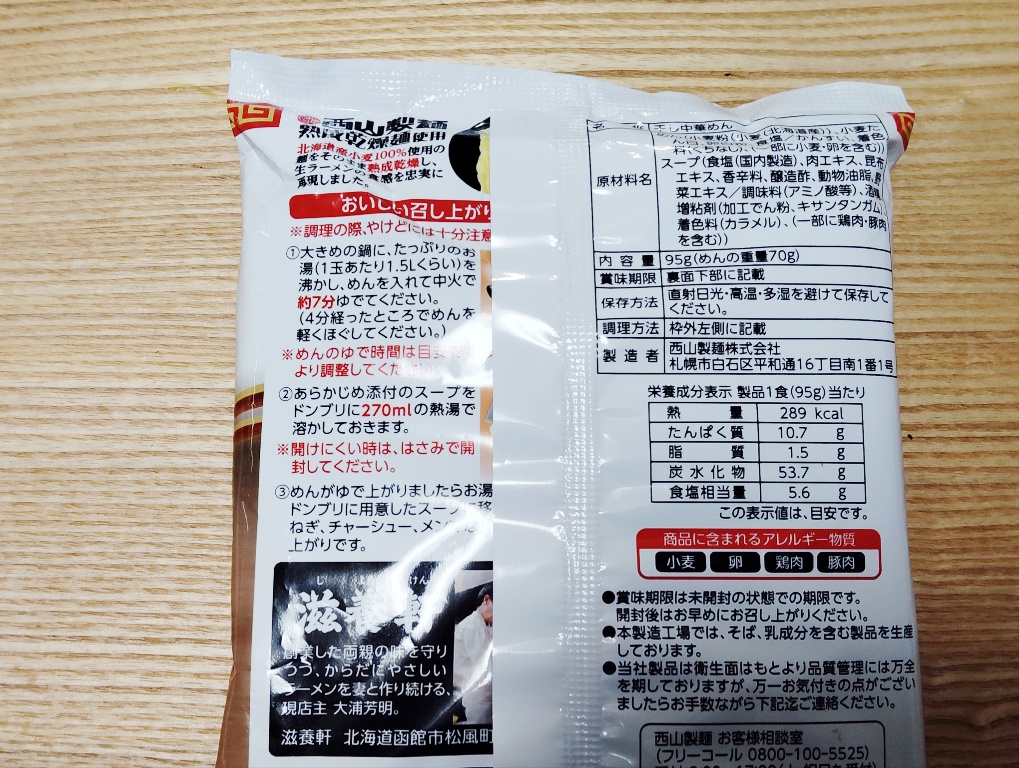 滋養軒は函館のお店だけれど、この袋ラーメンは札幌の西山製麺が出しています。1人前で