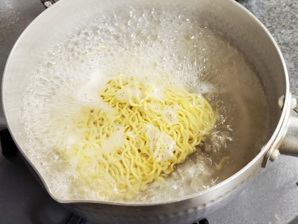麺の茹で時間が7分と眺め。そんな時間がかかりそうな麺にも見えなかったんですけど、実際は火力もあると思うけれど8分でようやくちょうどいいかたさになりました。滋養軒の麺は自家製。あの麺を西山製麺が同再現したんだろう・・・と興味津々でお鍋を眺めてました(笑)