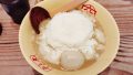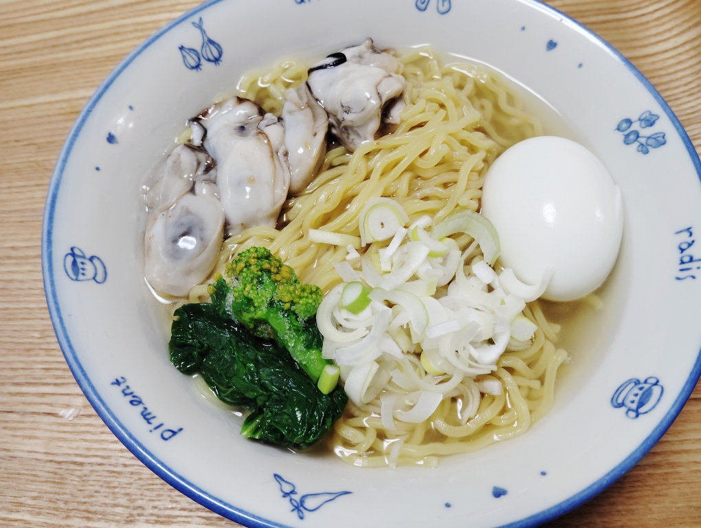 はい出来上がり。滋養軒ではトッピングはネギ、メンマ、チャーシュー2枚だったんですけど、滋養軒で食べたときに、お肉よりも魚介のトッピングや野菜のほうがこのラーメンには合いそう打と思ったので、生ガキ(サムライオイスター)、茹で卵、ネギ、菜の花をトッピングしました。