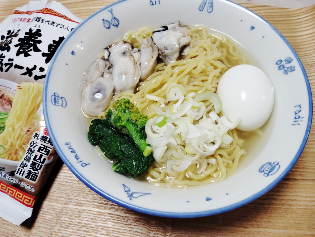 正直、滋養軒のラーメンとは麺もスープもだいぶ違うと思いました。麺はもっと細くてフワッとした優しい感じだったのに対し、こちらはしっかり目。スープもお店のは鶏や豚肉・昆布だしなどがバランスよく調和していたのに対し、袋は昆布がかなり強いかな。今はやりの味って感じです。どっちが良いということではなく、とにかく全く違います。ただ、予想通り、この生牡蠣トッピング、とても合いました。