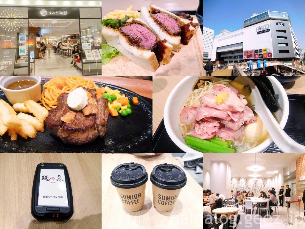 オススメ筆頭は1階にオープンしたフードコート”すみだフードホール”です。小さ目のフードコートで、10時オープンとともにどんどん人が入っていきます。小ぢんまりとしているのでお昼時は混雑必至です。