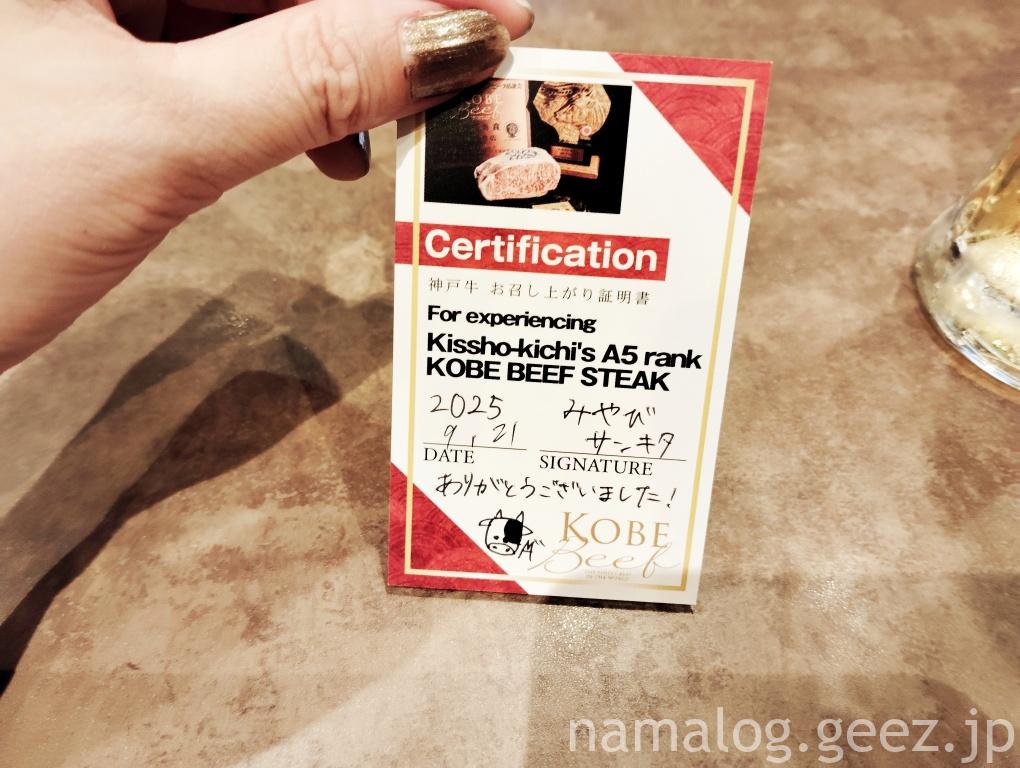 神戸牛はここ数年でさらに値段が騰がっているので、こうしたリーズナブルにいただけるお店はとてもありがたいです。うっすら乗り物酔いしていたので、あきらめたんですけど、サシの入ったとろけそうなにぎりも次回はいただいてみたいです。最後に私もこんな証明書をいただきました(*’ω’*)