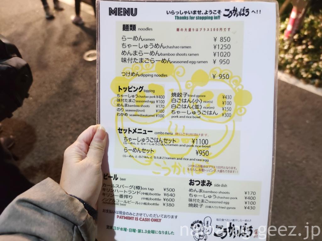 店内はカウンターが7席くらい。そして4人がけのテーブル席が2つ。こうかいぼうは開業時から券売機がなく、着席時に注文を取り、後会計のシステムを続けてします。