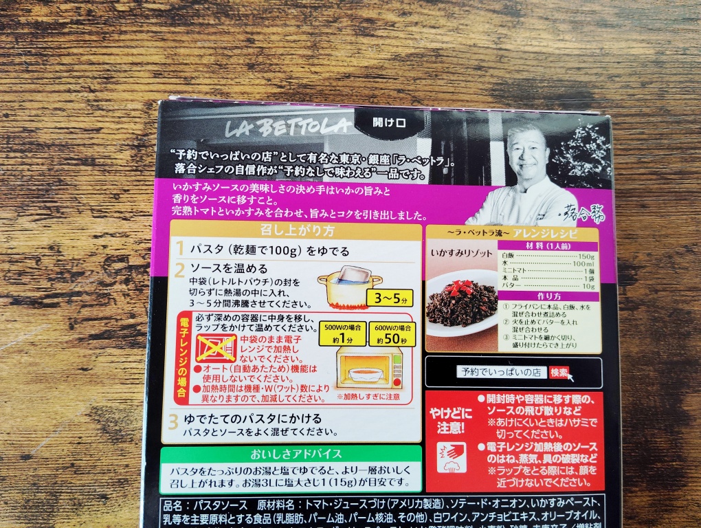 とにかく、ラ・ベットラの落合シェフを全面に出したパッケージ。「予約なしで味わえる」とはパワーワードですね( *´艸`) あ、今気づいたけど、これでリゾットも作れるんですね。食べ方はパスタを茹でて、温めたソースにかけて混ぜる、とシンプル。温め方は湯煎か、電子レンジ。
