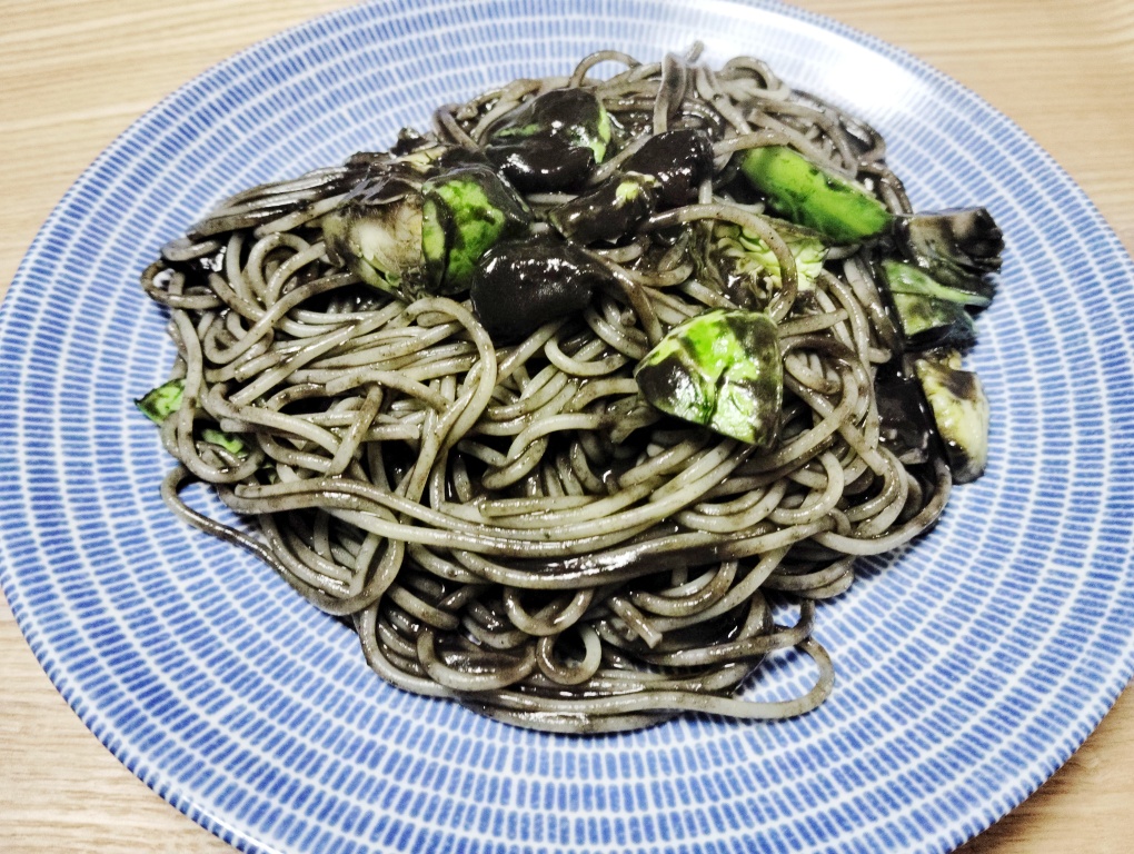 いかすみなので、本当はいかと合わせたかったんですけど、買いに行くのが面倒だったので、冷蔵庫にあった芽キャベツを具にしました。ちょっとシャバッとしたソースなので、ソースが下のほうに溜まっちゃったんですけど、それでもしっかりと絡んでいます。そして、この上にある黒いの。これはにんにくです。こんな大きなにんにくがゴロゴロ入ってました。ソース全体にもにんにくやトマトの風味があっておいしかったです。