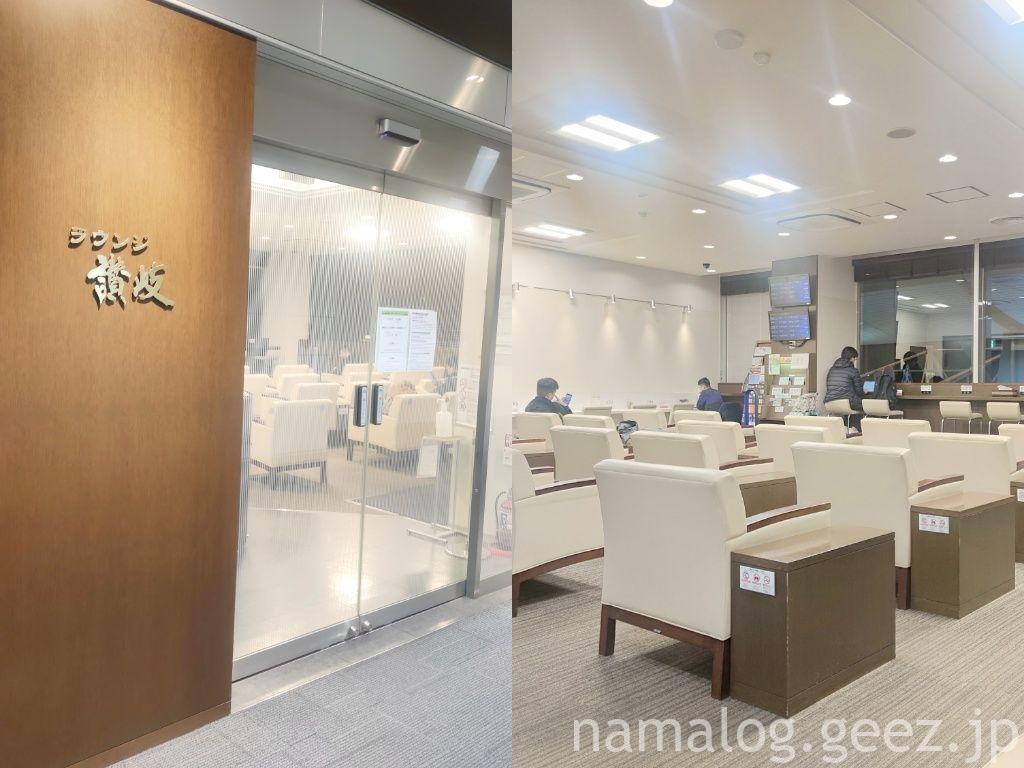 高松空港は比較的こぢんまりとした空港なんですけど、カードラウンジが出発ロビー(保安検査場の外)にあります。それがこのラウンジ讃岐。ANAラウンジみたいな航空会社のラウンジがない高松空港にあって、とても重宝されてるみたいなんですけど、40席ぐらいしかないので、人気路線の搭乗時刻付近は入れないこともあるかも。