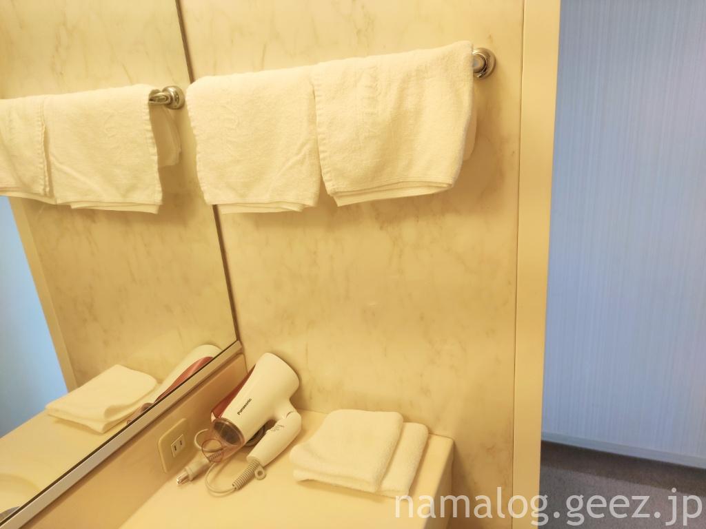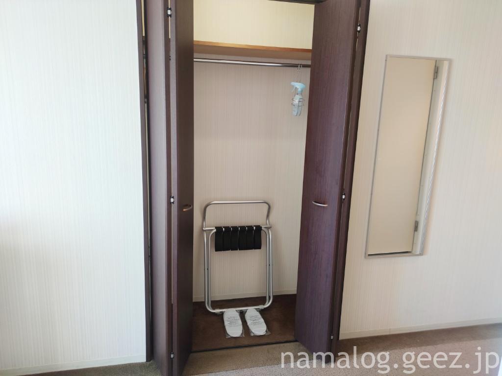開閉できるクローゼット。脇には鏡。使い捨てスリッパも置いてありました。