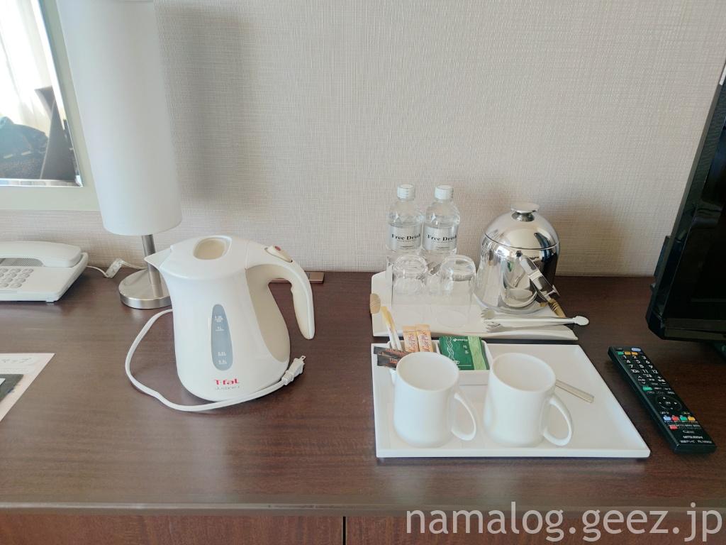 デスクの上は液晶テレビや、電気ポット。アイスペール、ミネラルウォーター・グラス・コップが1人でも2つずつ用意されていました。その他ティーバッグやコーヒーパウダーなど。エアコン、Wi-Fi、冷蔵庫はもちろんあります。氷は別のフロアにありました。