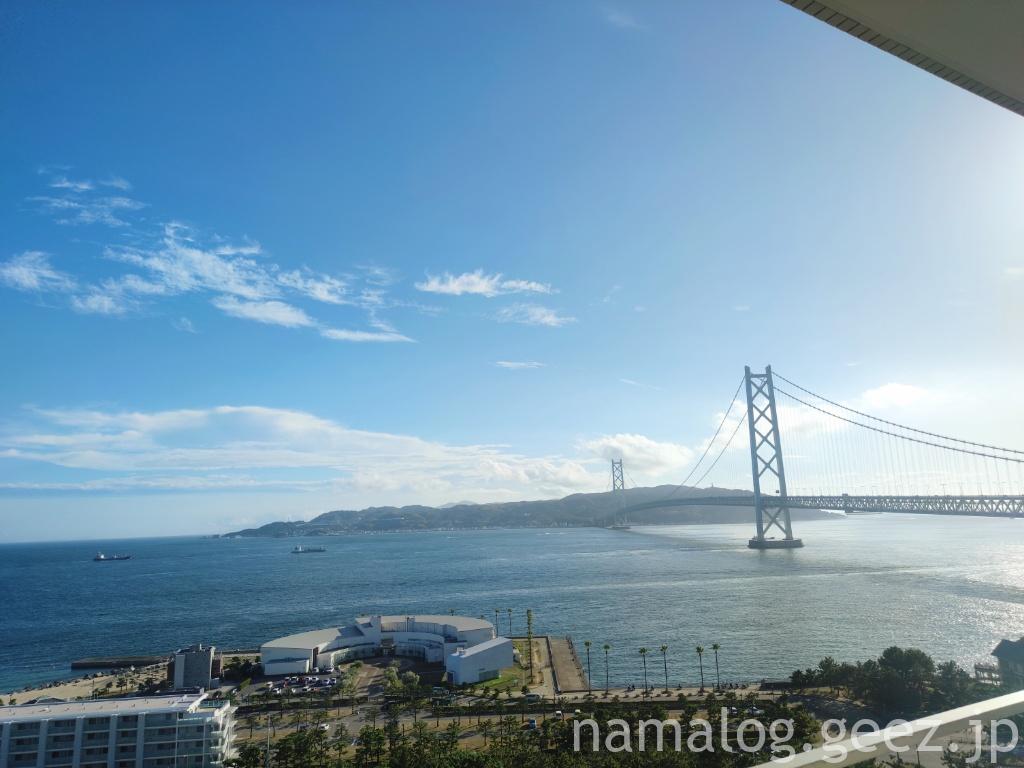 右側には明石海峡大橋。眼下に見えるのは舞子公園。歩いて行けます。これがシーズンオフだとびっくりするような値段で泊まれちゃうことも。外が暑かったこともあり、この景色を眺めながら飲むただの水がおいしかったです(笑)