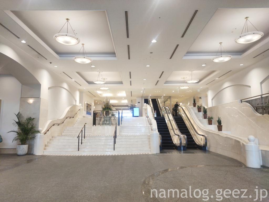 ロビーは白亜の宮殿の中のような豪華なつくり。このエスカレーター(階段でもいいけれど)をあがるとフロントとロビーです。