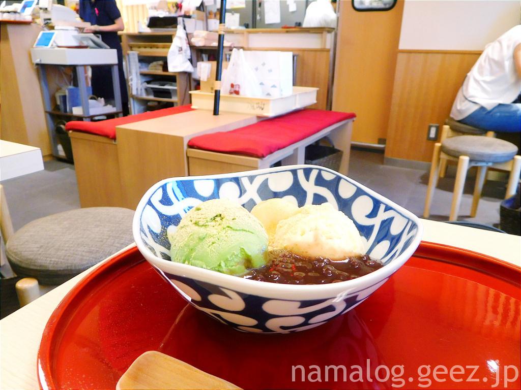 バニラビーンズたっぷりのバニラアイスと抹茶アイス。どちらもさっぱりとしていて甘さ控えめ。あまい小豆と一緒に食べるとちょうど良いです。