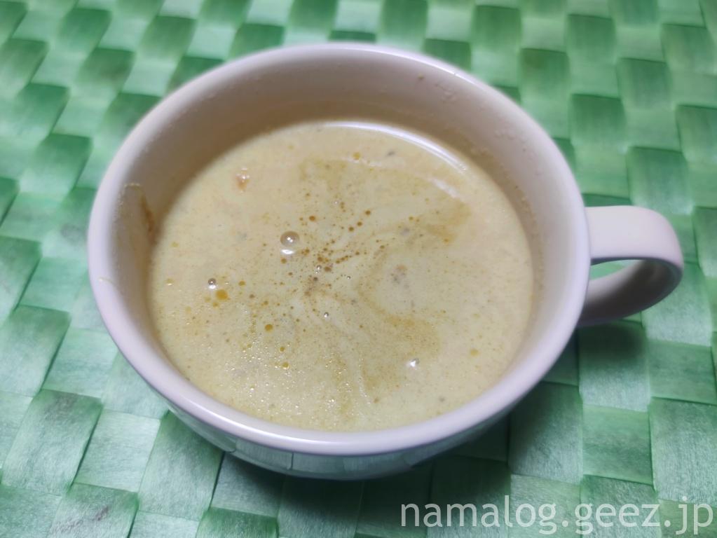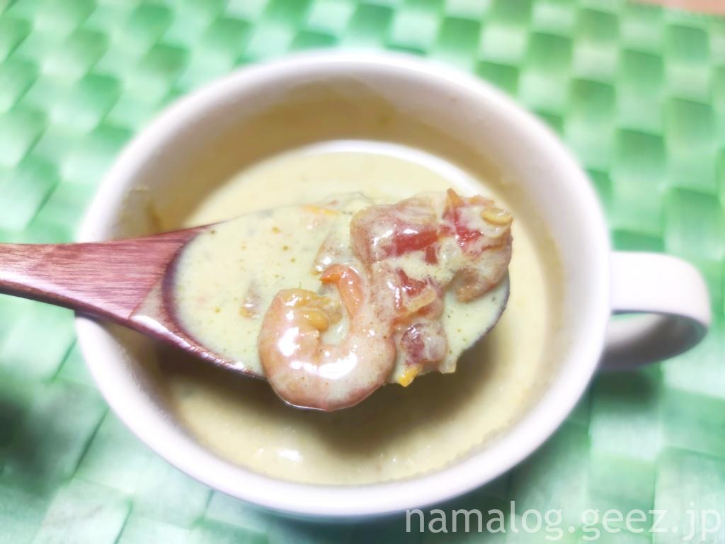 内容量は180gということで、スープカップでちょうどいい量。昔に比べて量が減りましたね。昔の量だと小食の2食分だったけれど、今はしっかり1人前です。カップに注いでるそばからココナッツの甘い香りがします。でも甘ったるすぎない。そして海老の香り(*’ω’*)