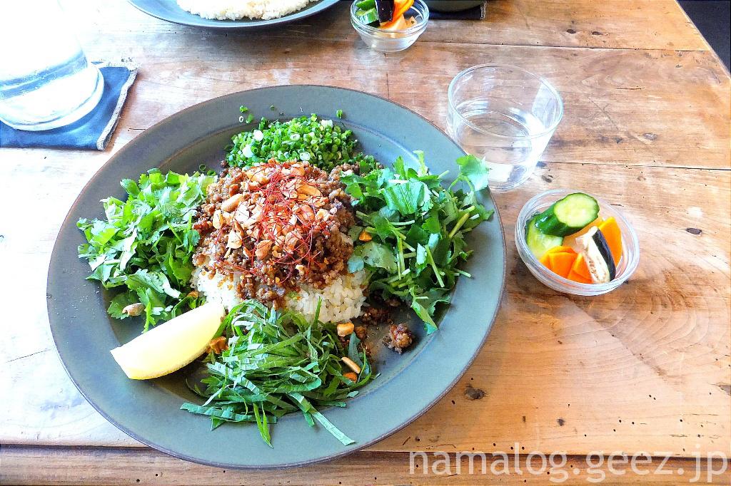 スパイシーなそぼろカレーの乗ったご飯の四方にパクチー、大葉、ネギがこんもりと盛られて、まぜまぜしながら食べます。お好みで添えられたレモンを絞って。そぼろの上にはナッツや糸唐辛子も載ってます。