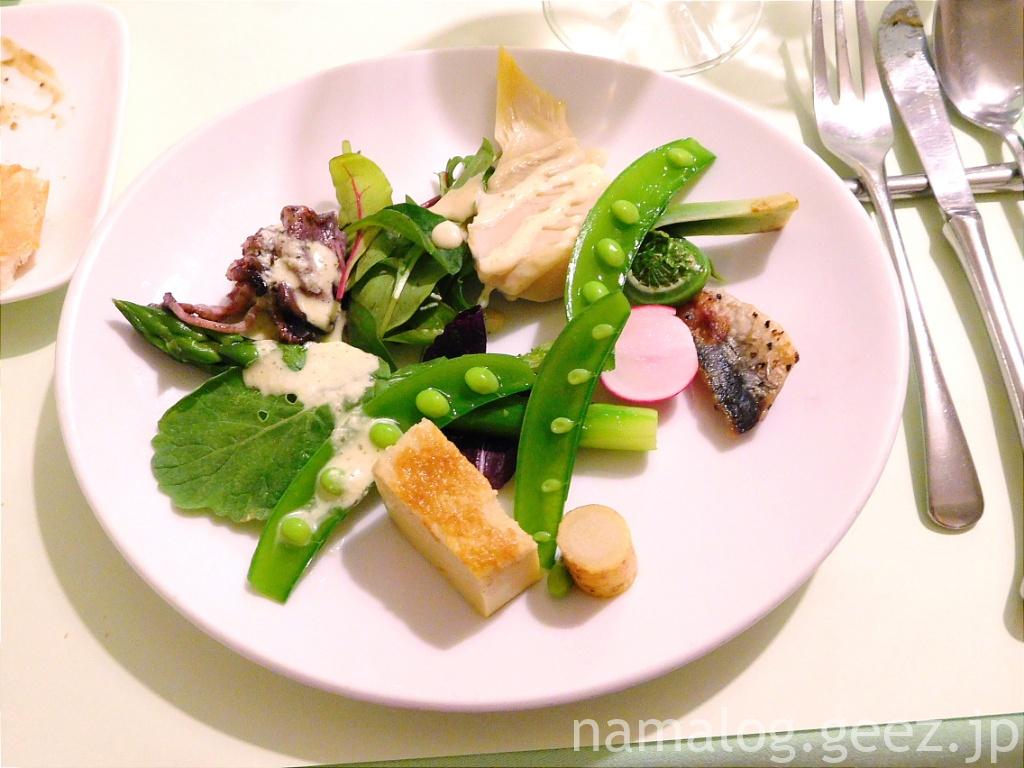 前菜です。鮮やかなグリーン。春感満載。どの野菜もみずみずしいです。大好物のいか(ヒイカ)ものってます!