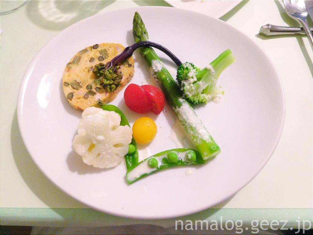 前菜は彩りも春らしく、食材も春。このお皿のメインは信州のグリーンアスパラガスですね。このアスパラが太くてみずみずしくて、とても美味しいんです。左上のテリーヌのツブツブしているのはワラビです。ぺるしぃは野菜が特に美味しい。野菜を食べるのがこんなに楽しみにできるお店ってなかなかないですよね。