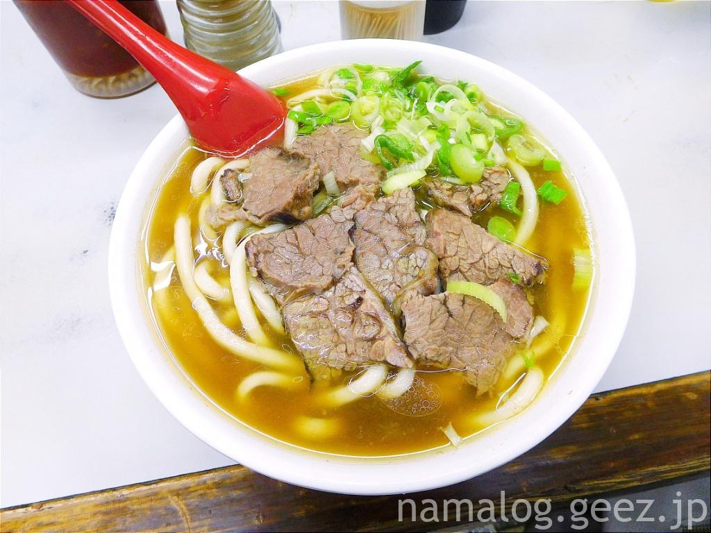 牛筋たっぷり。柔らかいです。麺はうどんのような感じです。というか、うどんですね。もちもちとしています(^^) 実はこちらの牛肉麺には、太麺と細麺があるそうで、何も言わなければ、この太麺が出てきます。