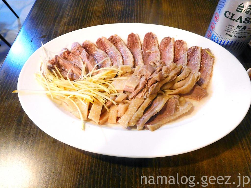 ・・・というわけで、いまいち言葉が理解できない中、状況的に私にちょうどよい量の盛り合わせがでてくるんだろうと考えて受け入れた盛り合わせの注文がこちらです。260元ぐらい。ほんと、ちょうどよい量!上が前段(胸肉)、下が後段(もも肉)。左の針みたいなのは生姜です(*’ω’*)