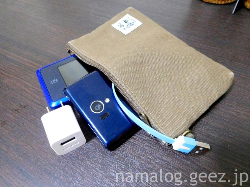 Wimax2のルーター、USBコード、ACアダプタ全部入りますし、スマホも収まります。