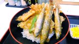 上の張り紙も載せましたが、この日の天丼はえび、きす、芝えび、ヤリイカ、稚あゆというメンバー構成でした。ちなみに実際には。ほかにさつまいもやししとう等野菜や海苔の天ぷらも入っていて、お腹も満足の一品。