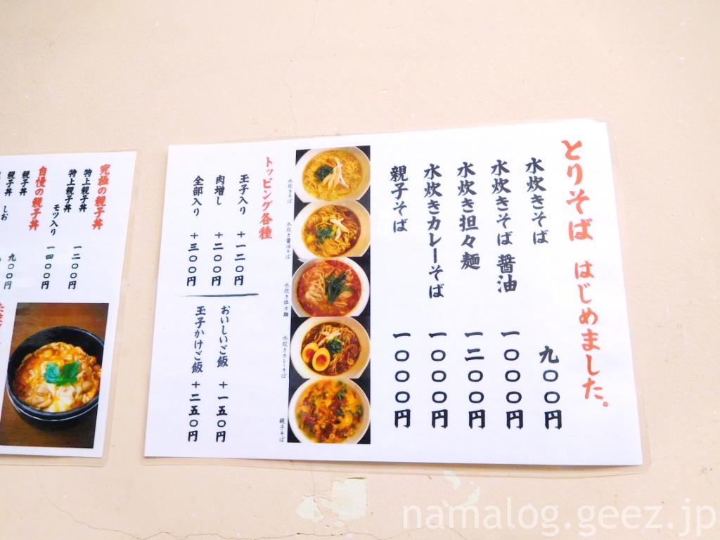 水炊きそば900円、水炊きそば醤油1,000円、水炊き担々麺1,200円、水炊きカレーそば1,000円、親子そば1,000円