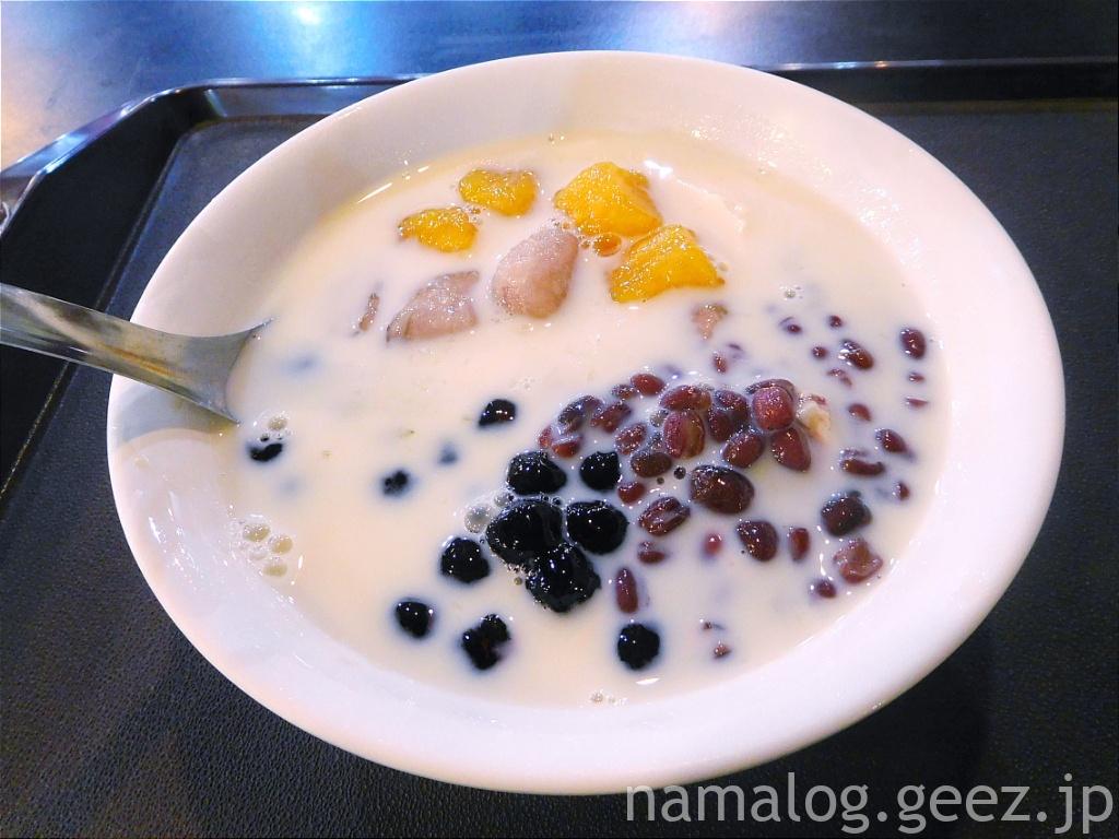こちらの豆花には豆漿がかかっています。トッピングは、花豆、紅豆、緑豆、ピーナッツ、タピオカの5種類があり、基本的に2種類選びます。(”総合”とついているものは全種類)