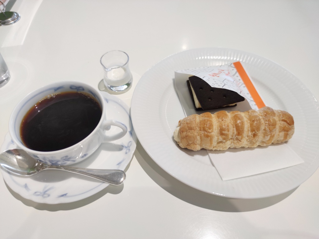 おなかがすいてなかったので、パンケーキなどは入らないということで雪こんチーズとサクサクパイ、そしてコーヒーを注文しました。雪こんチーズやサクサクパイは喫茶室のメニューにはないんですけど、1階のショーケースにあるものは2階でもいただくことができます。でも正直、コーヒーが400円なので、この2つを食べたいだけなら1階の立ち食いイートインコーナーでもいいと思います(笑)