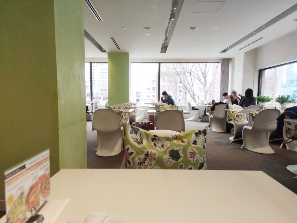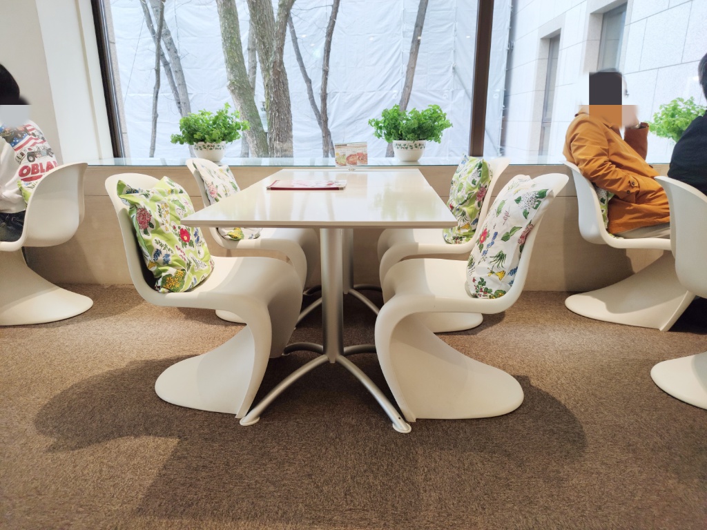 店内は窓が大きく開放的。白を基調としていて、六花亭の花柄のクッションがアクセントになっています。